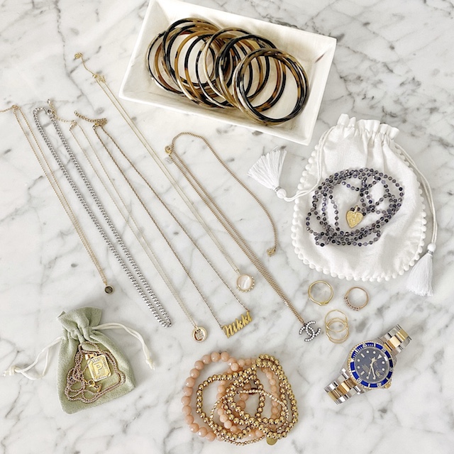 Horn bangles; Necklaces left to right: P initial necklace, similar small gem necklace, silver chain necklace, E initial necklace (similar also here), Nikki nameplate necklace, medium gemstone necklace, Chanel necklace via Fashionphile, Gold & Gray beaded necklace; stackable gold rings; gold beaded bracelets