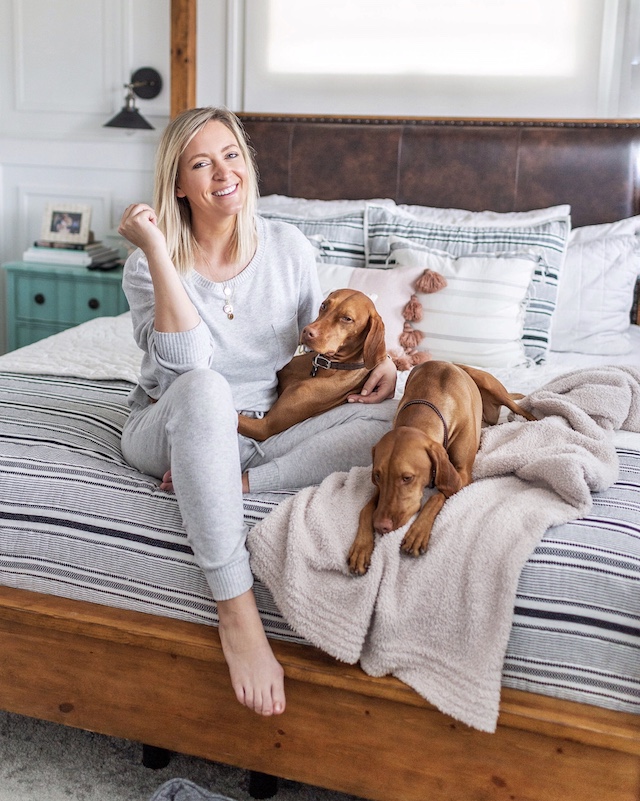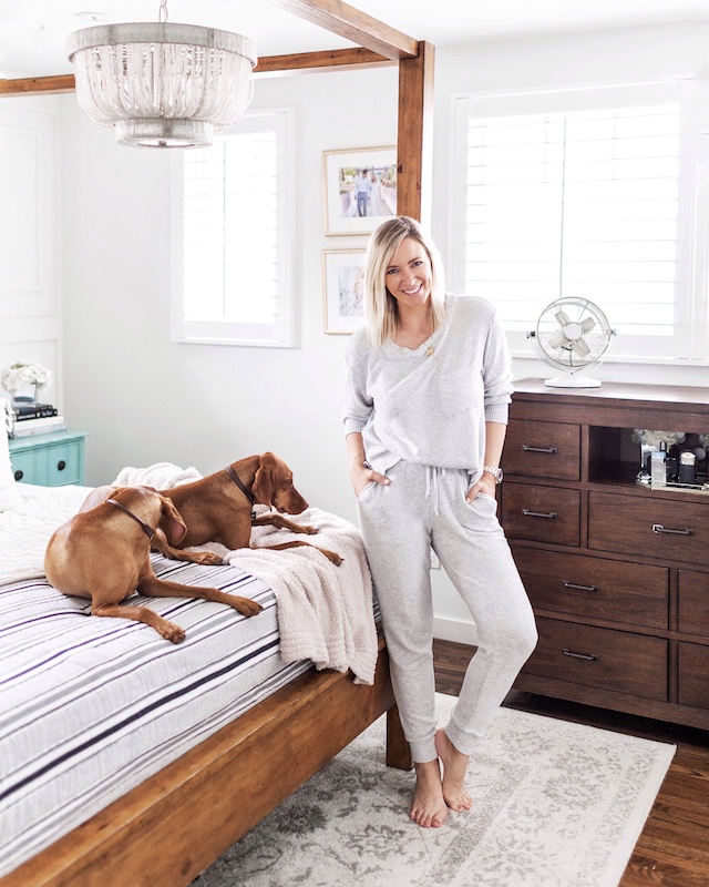 Target sweater and knit joggers; Barefoot Dreams blanket; Magnolia Home bedding